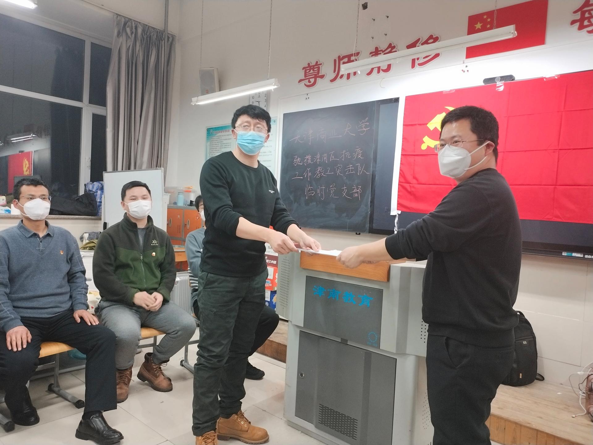 1月18日23时到达驻地后,全体队员随即接受了如何穿脱防护服以及重点防护注意事项等内容的专业业务培训,为第二天快速进入战斗状态奠定了扎实的基础。19日凌晨,beat365英国官方网站驰援津南区抗疫工作教工突击队临时党支部成立,下设五个党小组,在抗击疫情前线筑起了坚强的战斗堡垒。在支部书记、突击队领队郭卫中的带领下,快速建立了沟通联络和工作机制,并召开会议及时传达传达市教育两委和学校党委工作部署要求,统一思想、明确目标,开展集体谈心谈话,帮助大家缓解心理焦虑、打消思想顾虑,进一步增强了团队的向心力、凝聚力和战斗力。1月24日晚,学校驰援津南区抗疫工作教工突击队临时党支部开展“弘扬伟大抗疫精神,砥砺初心担当使命”主题党日活动,更加坚定了队员们战胜疫情的信心和决心。突击队队员、体育教学部贾洪祥副教授被党员同志服从安排、纪律严明的政治素质和无畏向前、真心为民的高尚品质深深触动,向党组织递交了《入党申请书》。