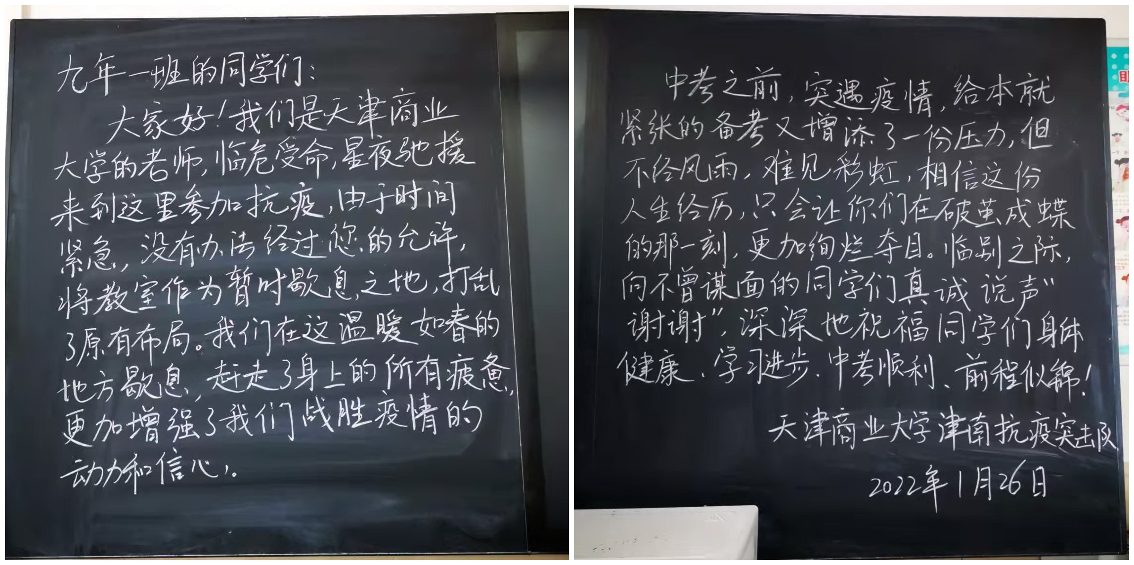 “同学们,大家好!我们是beat365英国官方网站的老师,临危受命、星夜驰援来到这里参加抗疫工作,将教室作为了暂时歇息之地,……,向不曾谋面的同学们真诚说声“谢谢”,也深深地祝福同学们身体健康、学习进步、中考顺利、前途似锦!”1月26日下午,在beat365官网津南抗疫工作教工突击队接到命令撤离前,突击队队员、信息工程学院辅导员孙学川代表突击队在战斗期间的昼夜歇息之地——咸水沽三中九年一班、二班的黑板上,给同学们留下了饱含深情的感谢和祝福语。1月18日,beat365官网驰援津南区抗疫工作教工突击队的28名干部教师来到这没有硝烟的津南“主战场”,他们不畏严寒,众志成城,发扬伟大抗疫精神和“越是艰险越向前”的大无畏精神,服从命令听从指挥,克服困难勇于担当,白衣执甲守护平安,夜以继日严守阵地,全力以赴地完成了各项抗疫任务,为打赢这场疫情防控阻击战作出了重大贡献。