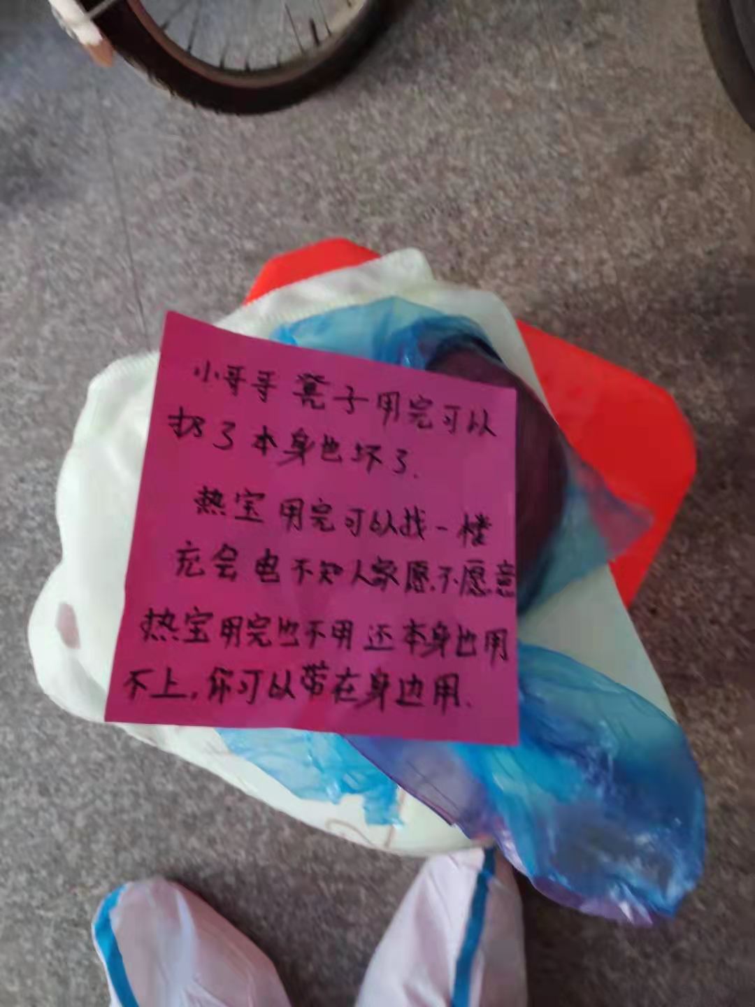 突击队员、经济学院张圆在给居民送菜上楼时,一个小妹妹硬塞了一袋子爱心物品出来,上面贴了一张粉红色的便签纸:“小哥哥,凳子用完可以扔了,热宝用完可以找个地方充会电,不用还我,你带在身边用。”还有的居民直接从楼上给队员们抛下装有热水的矿泉水瓶,让大家暖手......这些暖心的一幕幕,队员们的寒冷、苦累也都随之化为了彼此家人般的温暖,化为了与封控区居民共同奋战到底的决心和勇气。