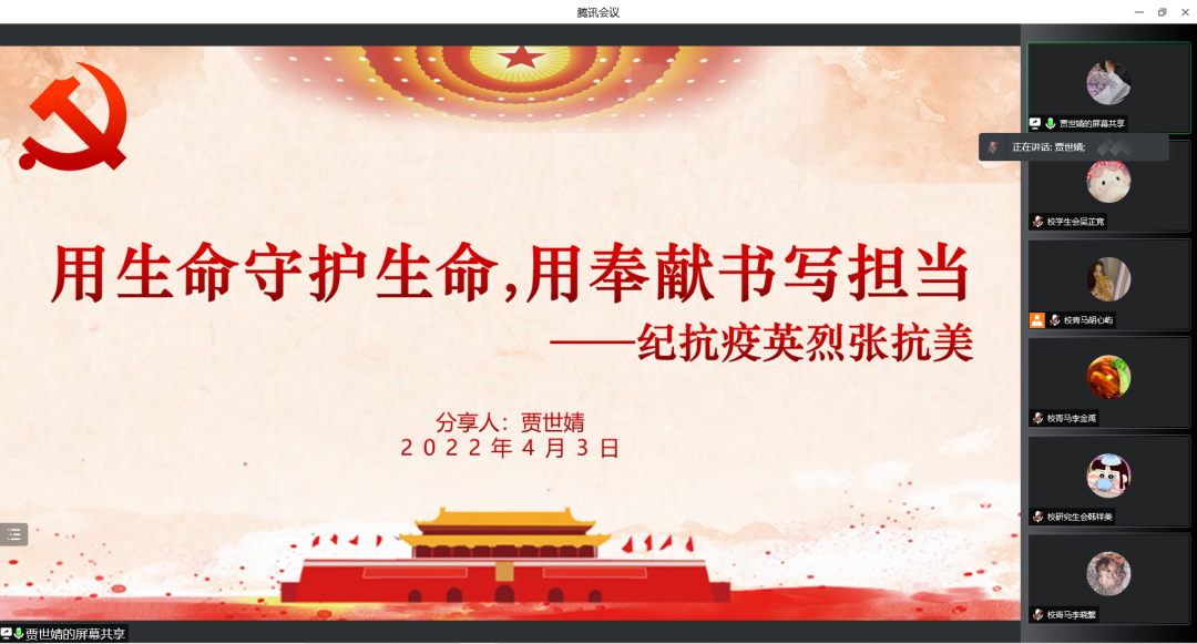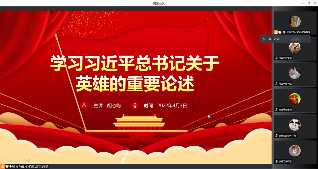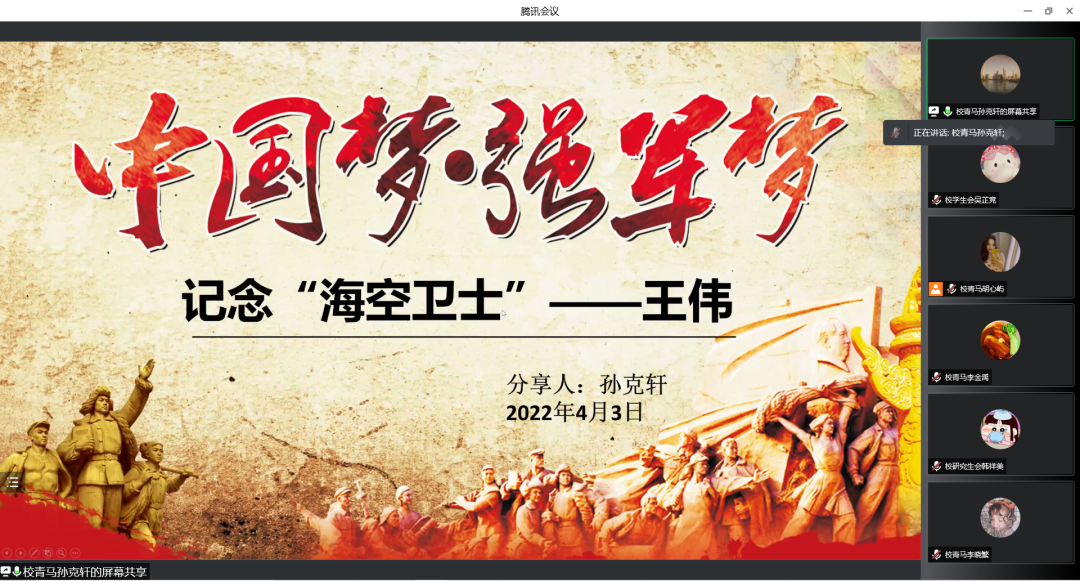 4月3日上午,校团委开展了“红色传承·清明祭英烈”线上主题团日活动,深入学习贯彻习近平总书记关于崇尚英雄,缅怀英烈的重要论述,扎实推动党史学习教育常态化长效化,缅怀革命先烈、传承红色基因、铭记英烈事迹、学习英烈精神。校团委干部、校级青马学员、校学生会及校研究生会成员参加了此次活动。