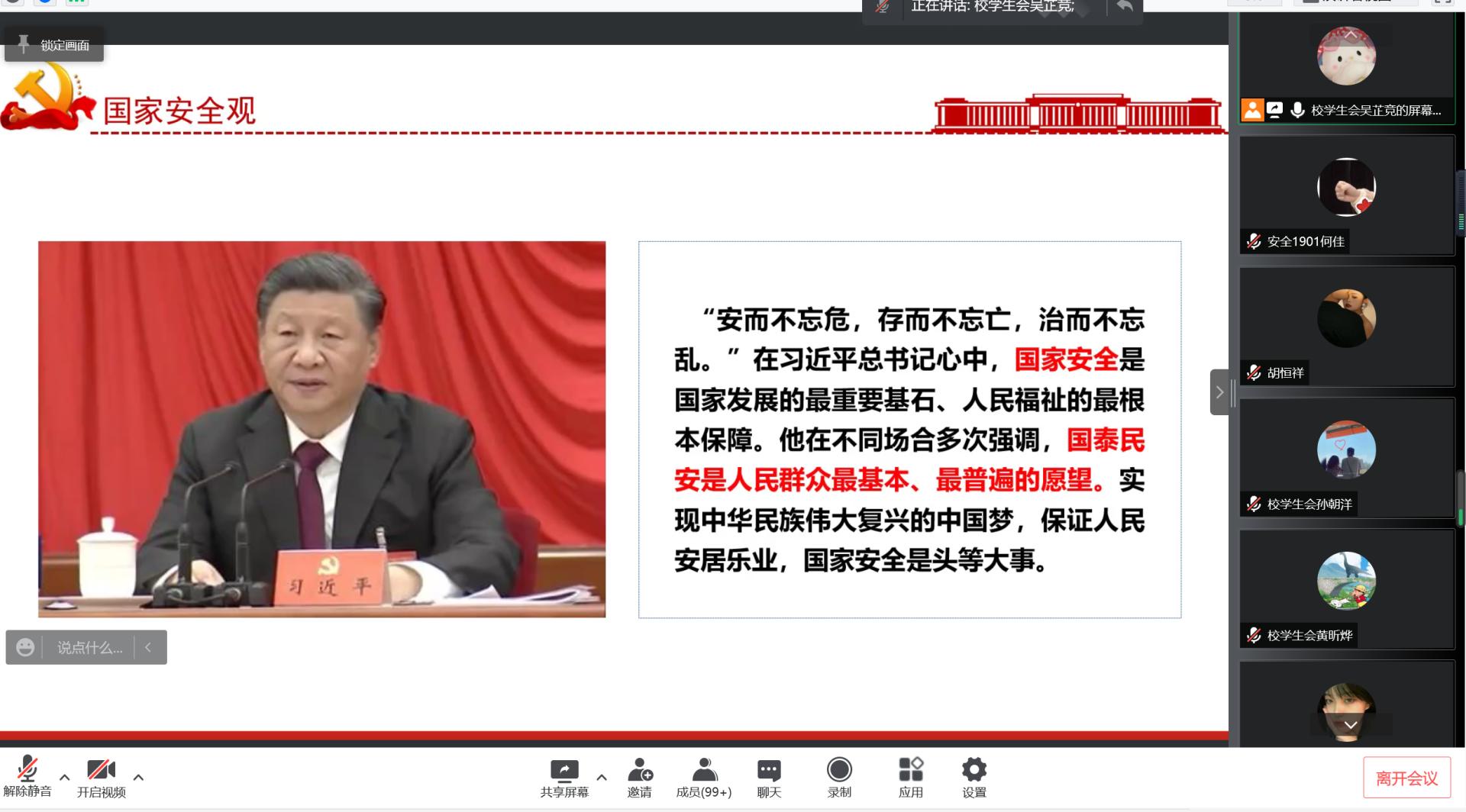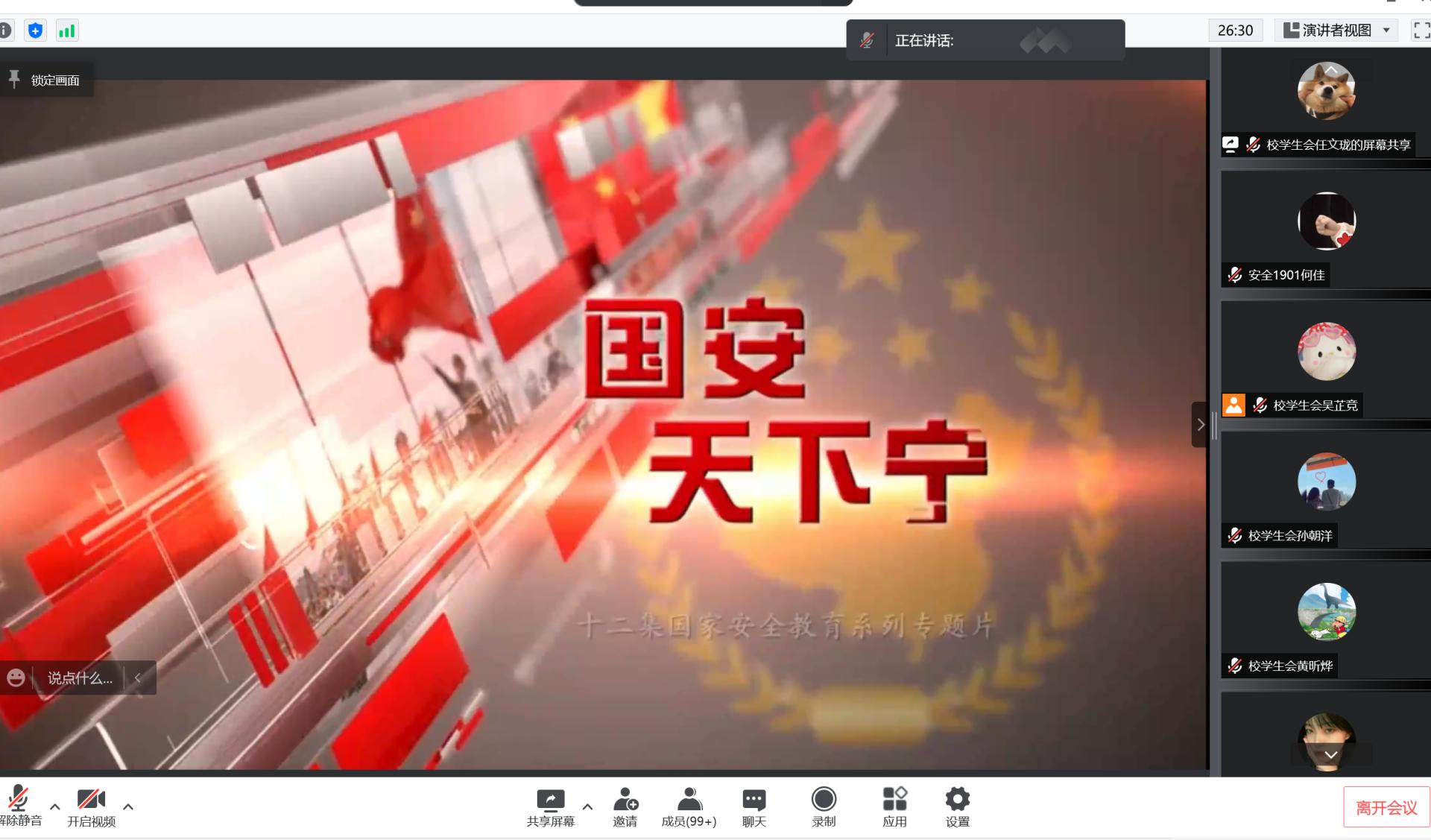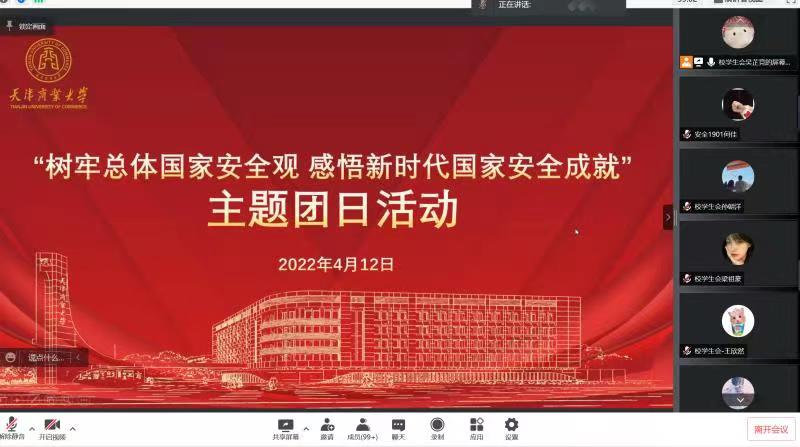 4月12日下午,在第七个全民国家安全教育日来临之际,校团委开展了“树立总体国家安全观,感悟新时代国家安全成就”线上主题团日活动。校团委干部、校院学生会、研究生会成员参加了此次活动。