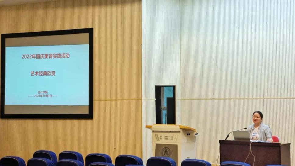 10月3日下午,会计学院2022年国庆美育教学实践系列活动在七教报告厅举行,学院党委副书记、纪委书记严慧菁主讲,会计学院辅导员以及100余名本科生、研究生参加。严慧菁以经典管乐曲《红旗颂》为切入点,带领师生对经典音乐与beat365官网艺术团的经典舞蹈进行赏析,并深入发掘其中蕴含的红色基因与中国精神,对学生进行润物无声式的爱国主义教育及爱校荣校教育。