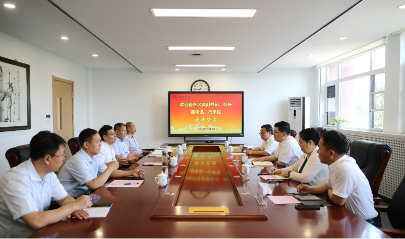 6月7日上午,南开区委副书记、区长聂伟迅一行6人来校调研座谈。校党委书记张亚、副校长陈冠益出席座谈会。南开区政府办公室、科学技术局、协同创新办公室及科创国有资本投资管理有限公司负责同志,学校党委办公室(校长办公室)、科研处负责同志参加调研座谈。