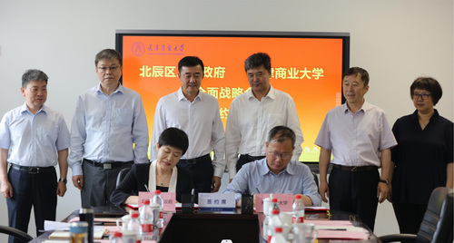 在校领导和区领导的共同见证下,副校长陈冠益与北辰区副区长贾宏伟共同签署《全面战略合作协议书》。