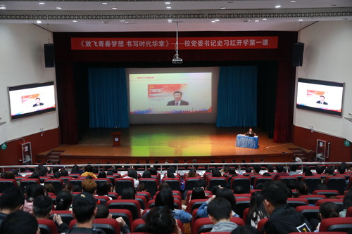 3月28日下午,校党委书记史习红以“放飞青春梦想 书写时代华章”为题,在科学会堂为本科生讲思想政治理论课暨“开学第一课”。各学院分管学生工作副书记,思政课教师代表,全体辅导员,校党委宣传部、学工部、校团委全体干部和学生代表近千人现场聆听。团委书记辛佳澎主持。