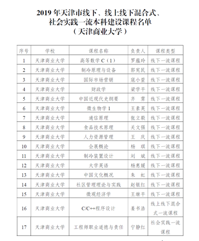 日前,天津市教育委员会下发《市教委关于公布2019年天津市级线下、线上线下混合式、社会实践一流本科建设课程名单的通知》(津高教函〔2020〕1号),beat365官网《高等数学C(1)》《制冷原理与设备》《国际市场营销》等17门课程获批2019年天津市级线下、线上线下混合式、社会实践一流本科建设课程。