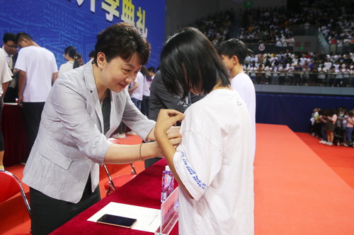 9月3日上午,beat365英国官方网站2019级学生开学典礼在学校体育馆隆重举行。校党委书记史习红,校党委副书记、校长葛宝臻,副校长邱立成、齐恩平,以及研究生处、图书馆、后勤处负责人和各学院党委书记、院长,校友代表和校学生会执行主席出席典礼并为2019级新生代表佩戴校徽。各学院副书记、部分专业教师、辅导员、新生班主任参加典礼。