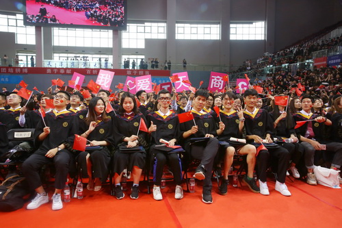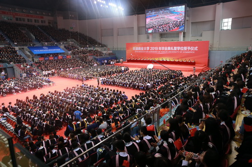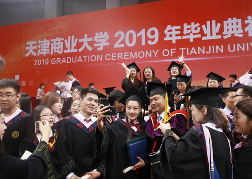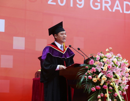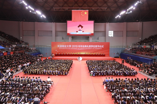 葛宝臻发表了热情洋溢的讲话,向全体2019届毕业生致以热烈的祝贺和诚挚的祝福,向培育同学们成长成才的全体教职员工和毕业生家长朋友们表示衷心的感谢。他指出,2019届毕业生用实际行动践行了“笃学、弘毅、明德、济世”的校训精神,学会了拥抱理想和生活、懂得包容和责任、勇于批判和创新、敢于想象和实践,书写了无愧于青春的华彩篇章。学校见证了同学们的成长和成熟,同学们也见证了天商的发展和进步。在校的四年,是学校快速发展、综合影响力不断提升的四年,是学校校园环境、综合保障水平不断提升的四年,学校的美好未来期待着大家的回眸与归来、关注与支持。