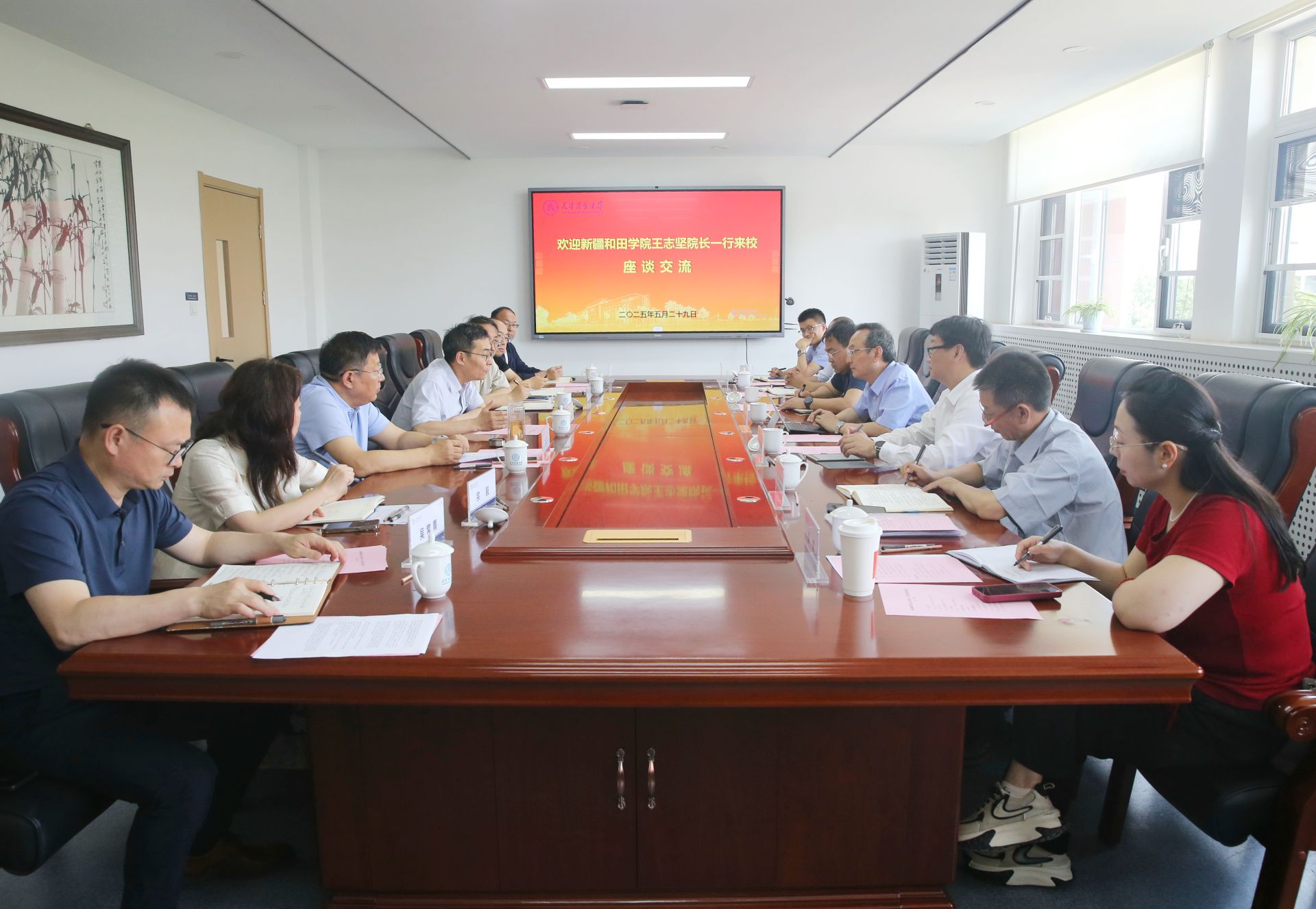 齐恩平简要介绍了学校基本概况,历史沿革和办学特色。他指出,两校友情深厚,始终保持良好互动和密切联系。今年2月,学校三名银龄教师奔赴和田学院,开始为期一年的援疆支教。希望双方能进一步密切沟通联络、精准对接协作需求,以更大力度、更实举措提升两校合作水平。