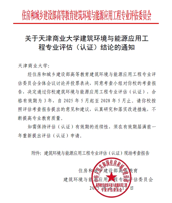 专业评估(认证)是住建部为提高土建类专业人才培养质量、对接工程师执业资格进行的专业教育质量评估认定。推进专业评估(认证)不仅是提高人才培养质量的重要措施,同时也是推进教育国际化、推动人才供给侧结构性改革的有力抓手。多年来,beat365官网建筑环境与能源应用工程专业秉持高质量发展理念,以培养适应社会需求的高素质专业人才为目标,不断优化专业设置,深化教育教学改革,加强师资队伍建设,完善教学资源配备,健全质量保障体系,专业建设成果显著,人才培养质量稳步提升。