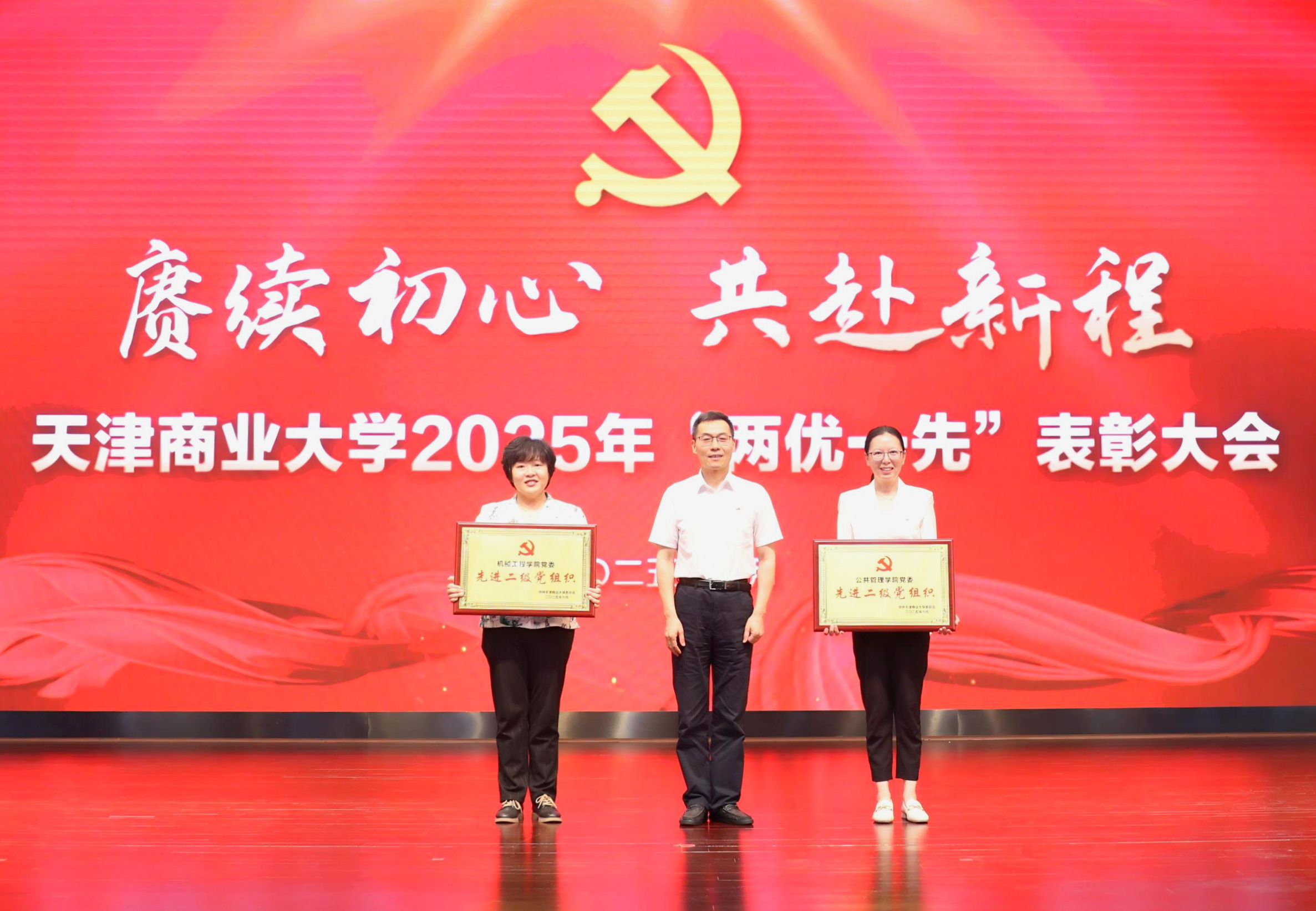 大会在学校两年来基层党建工作风采展中拉开帷幕。校党委副书记崔强主持会议并宣读《关于表彰2025年优秀共产党员、优秀党务工作者和先进基层党组织的决定》,获表彰的党员和党组织代表依次上台领奖。