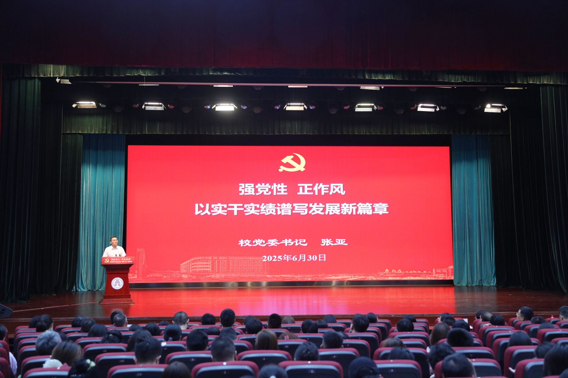 会上,张亚以《强党性 正作风 以实干实绩谱写发展新篇章》为题讲授了深入贯彻中央八项规定精神学习教育作风专题党课。张亚代表学校党委就学习教育的进展情况进行了通报,并从三个方面进行了重点讲授。一是以赤诚之心致敬中国共产党104周年华诞。他围绕“一个历史主题、两大历史任务、三条历史主线、四个历史阶段、五点历史启示”,全面梳理了党的发展脉络,带领全体与会党员重温党的光辉历程。二是以高的政治站位抓实学习教育。他围绕深入学习领会习近平总书记关于加强党的作风建设的重要论述,从党的作风建设的历史逻辑、理论逻辑和实践逻辑着手,深入阐释了加强党的作风建设的重大意义、核心要义和现实要求,强调全体党员要切实增强政治自觉、思想自觉和行动自觉,锲而不舍贯彻落实中央八项规定精神。三是以扎实学习成效推动学校事业高质量发展。他围绕坚决落实政治要求、坚持党性党风党纪一起抓、一体推进学查改,聚焦教育强国战略目标,为今后工作提出了明确要求,强调全体党员要坚定理想信念,厚植为民情怀,坚守初心使命,永葆清正廉洁,以优良作风凝心聚力、干事创业。