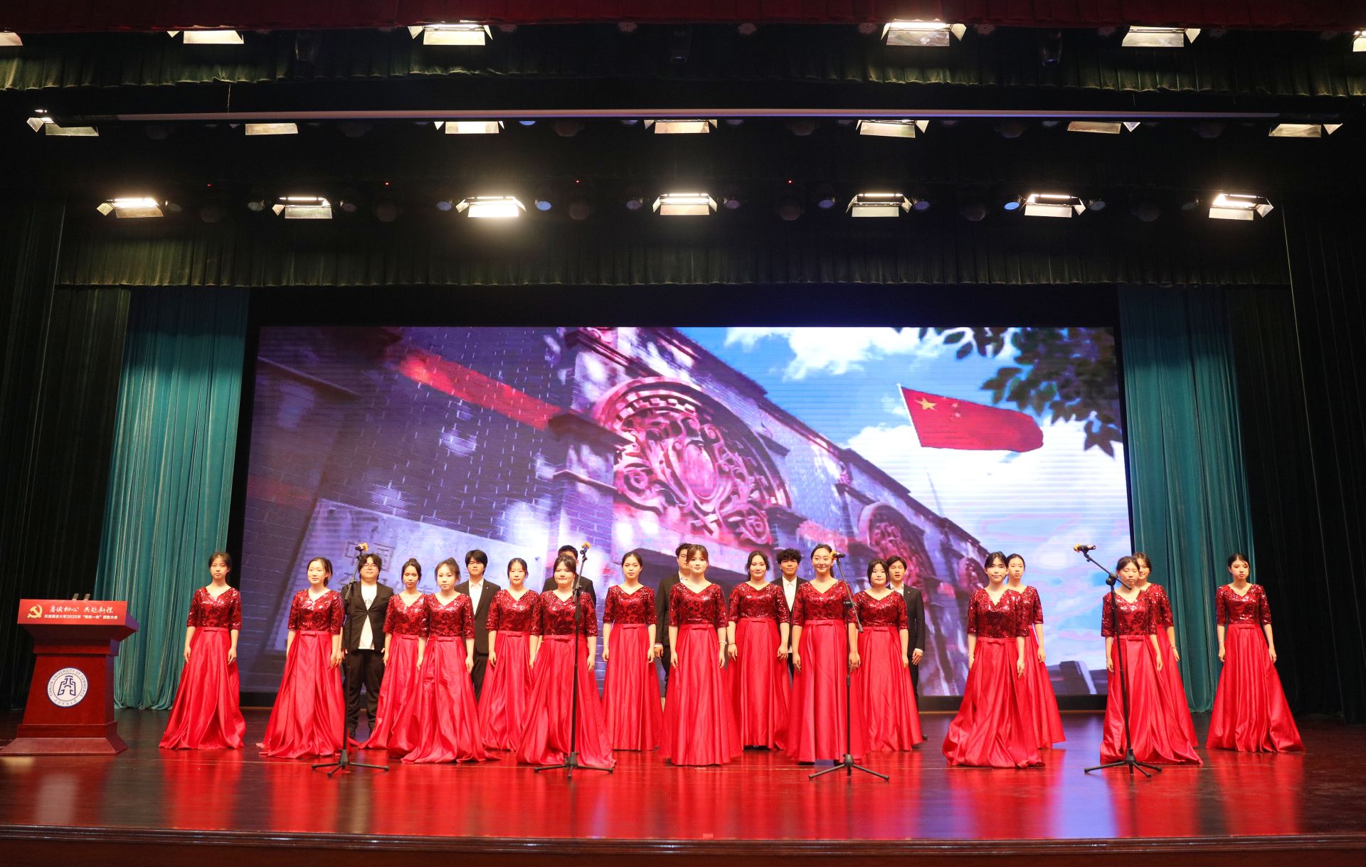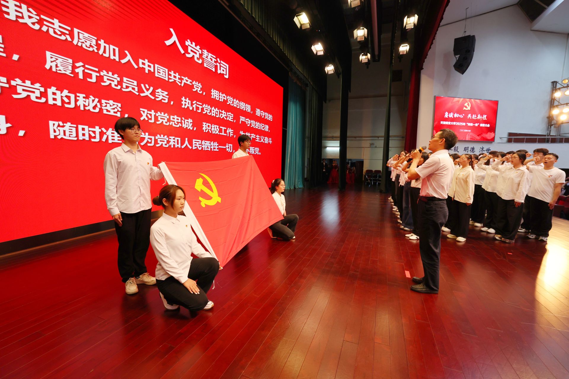 学校2025年新发展的学生党员代表、全体与会党员在校党委书记张亚的带领下,进行集体宣誓。学校星海艺术团合唱分团演唱了歌曲《领航》,为中国共产党成立104周年献上诚挚祝福。
