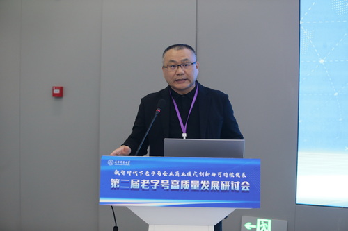 张亚在致辞中代表学校向拨冗莅临的各位领导、专家学者和企业家朋友们表示热烈的欢迎,向长期关心支持学校发展的各界同仁致以最诚挚的感谢。他指出,首届老字号高质量发展研讨会以来,学校积极与老字号企业合作,取得丰硕成果。在科研创新层面,学校整合校内外多学科资源,形成了一系列初步成果,组织专家团队编撰了老字号专著;管理学院、经济学院等多个团队成功申报多项省部级以上的老字号相关重点研究课题,学校还参与了商务部《中华老字号年度发展报告》的改版与编撰工作,出席第四届中华老字号创新发展大会并作经验分享;各学院积极为老字号企业提供专业的咨询服务,将理论知识转化为解决实际问题的方案。在人才培养层面,学校构建立体式、沉浸式的育人体系。连续三年组织“大学生走进老字号”主题社会实践活动,足迹遍布全国上百家老字号企业;邀请老字号传承人进校园,为学生讲授“老字号传承人大讲堂”;举办“带老字号回家过年”老字号嘉年华活动,让师生在选购年货的同时,感受非遗技艺与企业文化的魅力;积极挖掘研究老字号里的思政元素,编辑了《基业长青的红色基因--老字号中的党史党建故事》,同时,将思政课堂搬进老字号企业,从力生制药的匠心中品守正创新,从长芦汉沽的盐粒上读奋斗史诗等。学校还将老字号的故事搬上了舞台,原创话剧《商道之范旭东》即将首演。同时,积极承办各类大学生老字号创新创意创业大赛,激发青年学子热爱并投身老字号事业的热情。