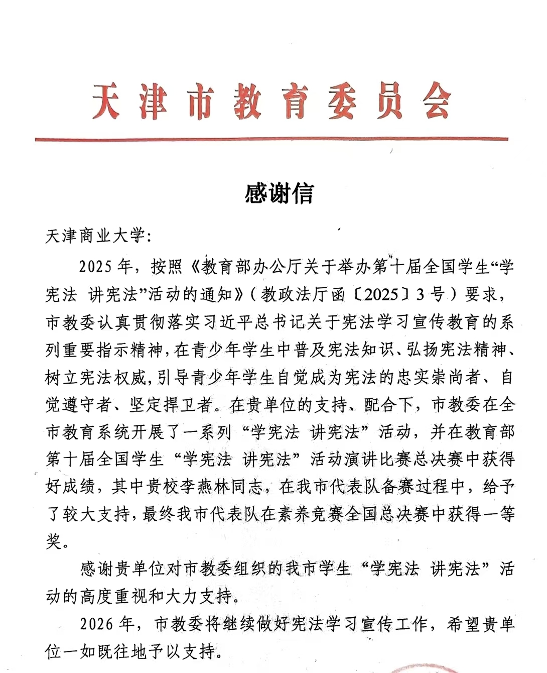 近日,市教委发来感谢信,就beat365官网对学生“学宪法讲宪法”比赛的支持和法学院教师李燕林给予市代表队的国赛指导表示感谢。
