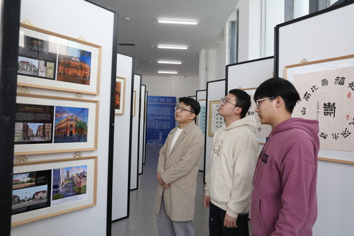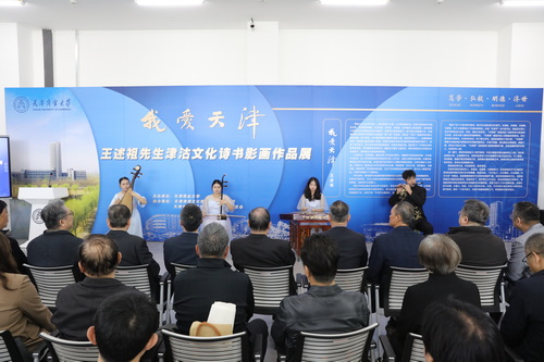 开幕式前,校团委精心组织学生献上精彩的民乐演奏节目;开幕式后,王述祖为来宾和天商师生现场讲解作品。