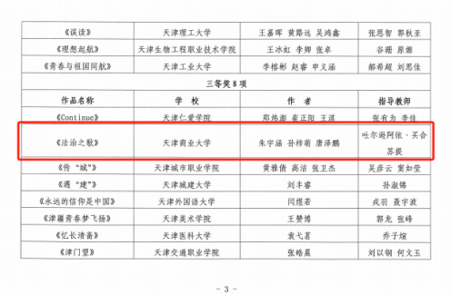 日前,市委教育工委、市教委公布了2024年天津市“牢记嘱托 奋楫笃行”原创思政音乐作品征集活动评奖结果,beat365官网法学院2023级本科生朱宇涵、唐泽鹏、孙梓萌制作的音乐作品《法治之歌》荣获大学组三等奖,指导教师为法学院辅导员吐尔逊阿依·买合苏提。