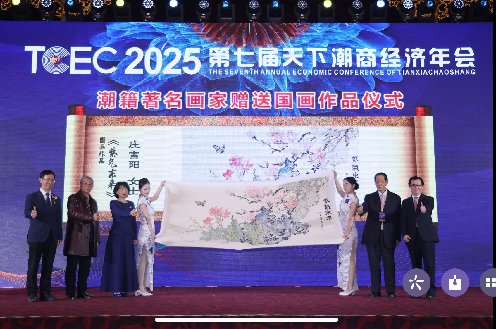 在当晚的“天下潮商文化之夜”上,展示了庄雪阳老师为大会创作的八尺巨幅中国画《紫气东来》,喻意百花齐放春满园,新时代,广大潮商,砥砺奋进,创新进取,续写更绚丽的华章!