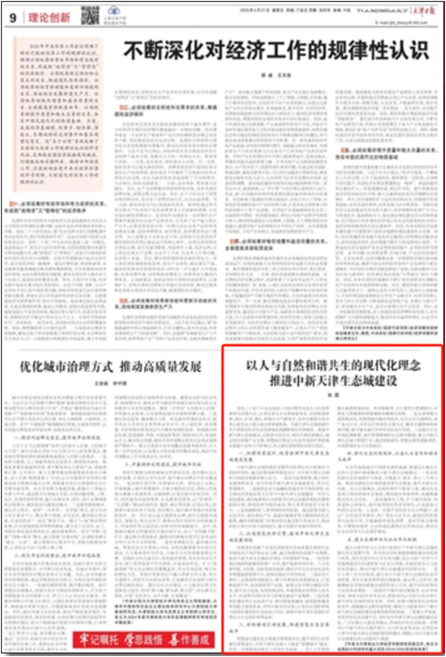 2月21日,《天津日报》(理论创新版)刊发经济学院张圆副教授理论文章。文章以中国式现代化中人与自然和谐共生的现代化视角出发,从加强顶层设计、打造绿色经济引擎、创新驱动引领发展、强化生态环境保护及建立全面评估与公众参与机制五个方面为中新天津生态城建设提供对策建议。