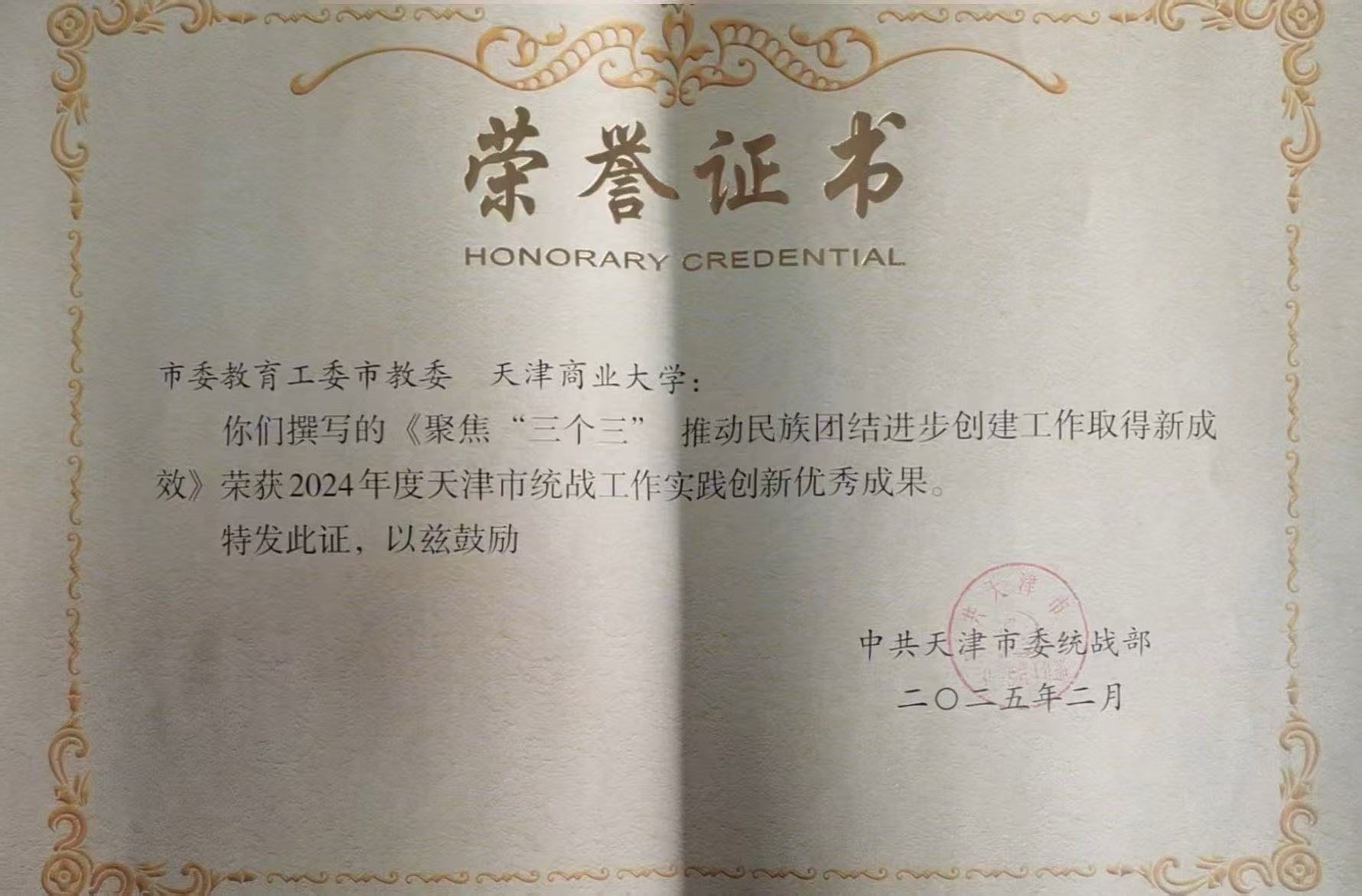 由党委统战部提交的《聚焦“三个三” 推动民族团结进步创建工作取得新成效》获天津市统战工作实践创新优秀成果。该成果认真总结了beat365官网在民族团结进步创建工作方面的主要做法和取得成效,归纳总结出了“聚焦‘强三实’,实现组织领导有力有效”“聚焦‘促三交’,实现思想引领走深走实”“聚焦‘提三化’,实现教育管理到位到底”的特色经验,为beat365官网持续深入开展民族团结进步创建工作打下坚实基础。