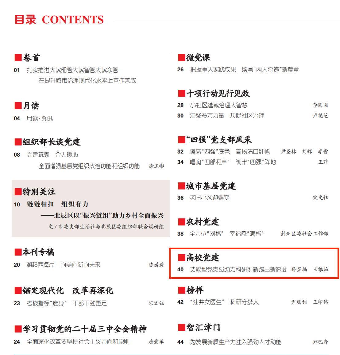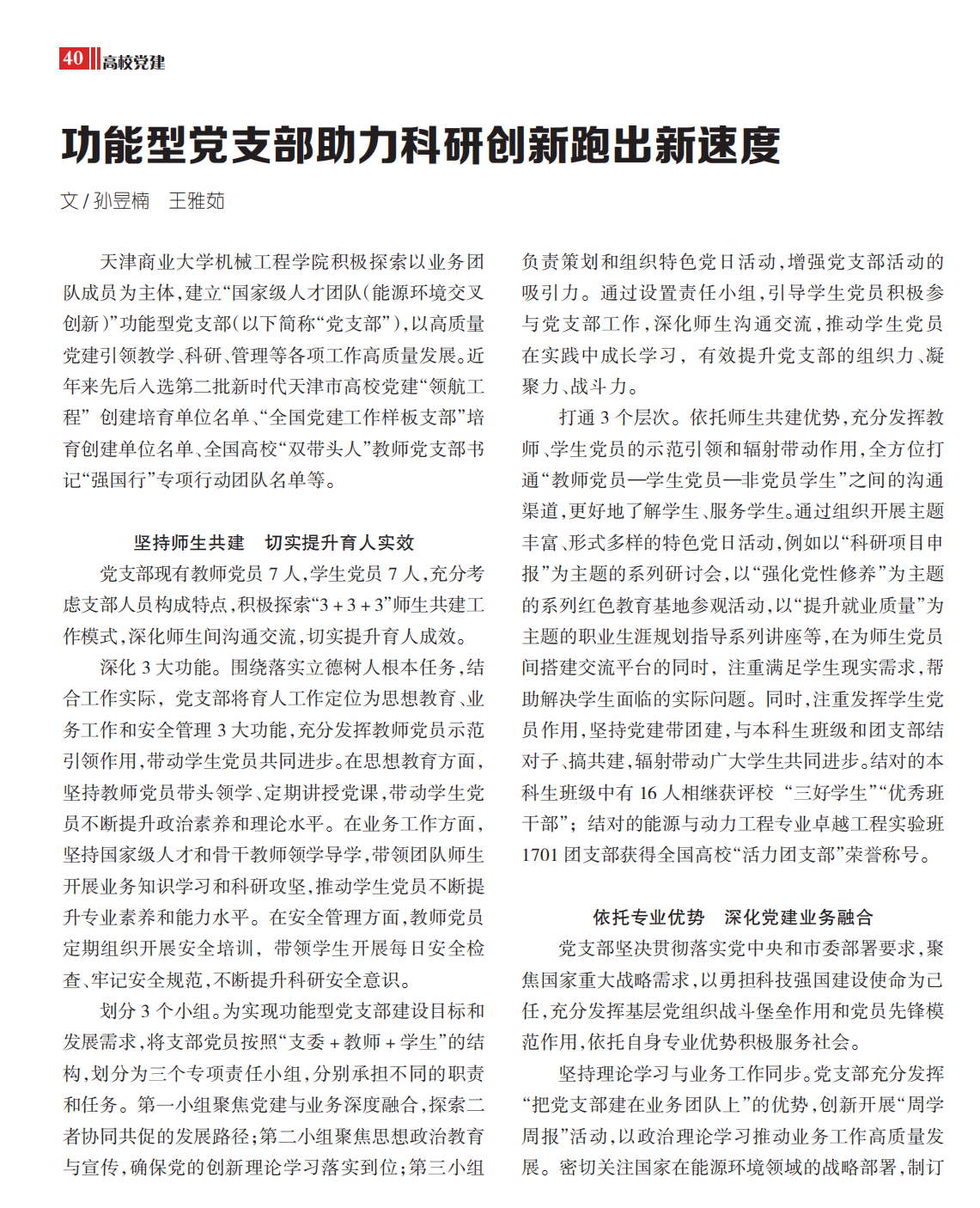 创新驱动,党建赋能。多年来,beat365英国官方网站坚持落实立德树人根本任务,不断探索党建与业务深度融合的新路径,以高质量党建引领教学、科研、管理等各项工作高质量发展。近日,《天津支部生活》杂志“高校党建”专栏发表beat365官网孙昱楠和王雅茹老师联合撰写的,题为“功能型党支部助力科研创新跑出新速度”的文章,详细介绍了beat365官网机械工程学院“国家级人才团队(能源环境交叉创新)”功能型党支部成立以来在支部管理模式、与业务融合方面的创新做法和显著成效。