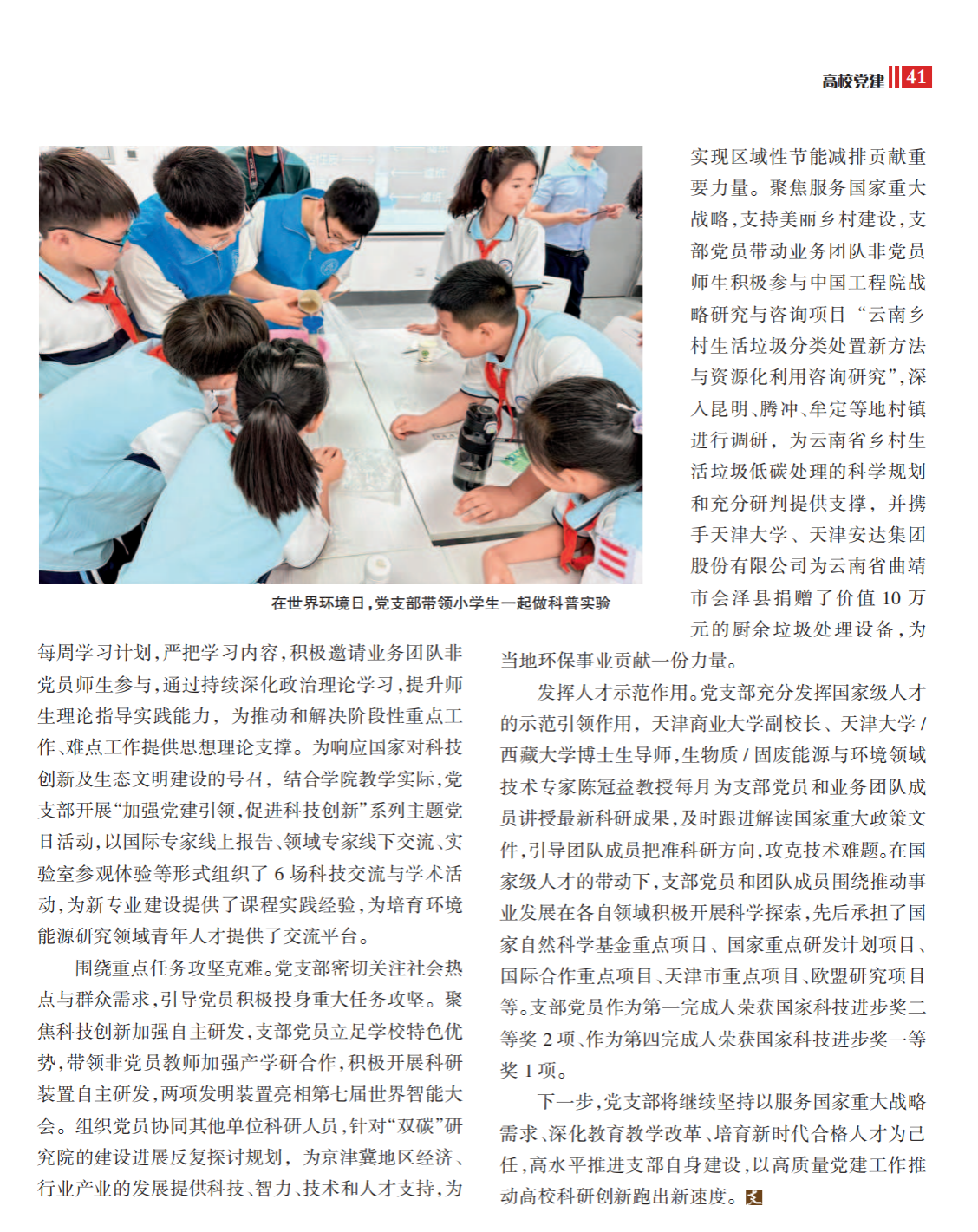 该支部自成立以来,依托师生共建和支部建在业务团队上的优势,创新工作方法,推动支部工作质量提升,先后入选第二批新时代天津市高校党建“领航工程”创建培育单位名单、“全国党建工作样板支部”培育创建单位名单、全国高校“双带头人”教师党支部书记“强国行”专项行动团队名单等。支部充分发挥战斗堡垒作用和党员先锋模范作用,积极服务社会,为国家重大发展战略贡献力量。报道原文如下: