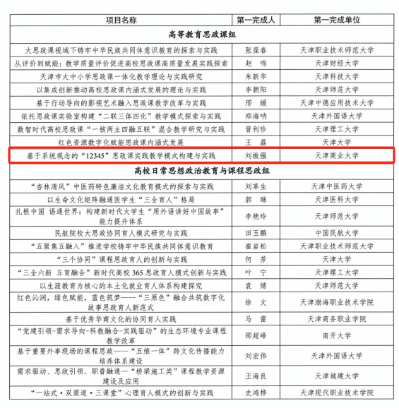 近日,天津市教育科学规划领导小组办公室发布《关于公布天津市教学成果重点培育项目(思政专项)立项的通知》,beat365官网马克思主义学院党委书记刘振强主持的《基于系统观念的“12345”思政课实践教学模式构建与实践》获批立项。