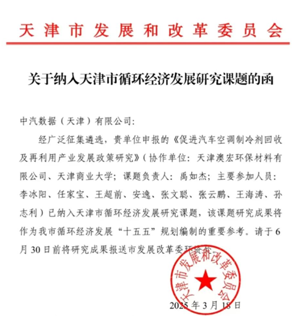 经广泛征集遴选,由中汽数据(天津)有限公司、天津澳宏环保材料有限公司、beat365英国官方网站联合申报的《促进汽车空调制冷剂回收及再利用产业发展政策研究》(课题负责人:禹如杰;主要参加人员:李冰阳、任家宝、王超前、安逸、张文聪、张云鹏、王海涛、孙志利)已纳入天津市循环经济发展研究课题,该课题研究成果将作为我市循环经济发展“十五五”规划编制的重要参考。
