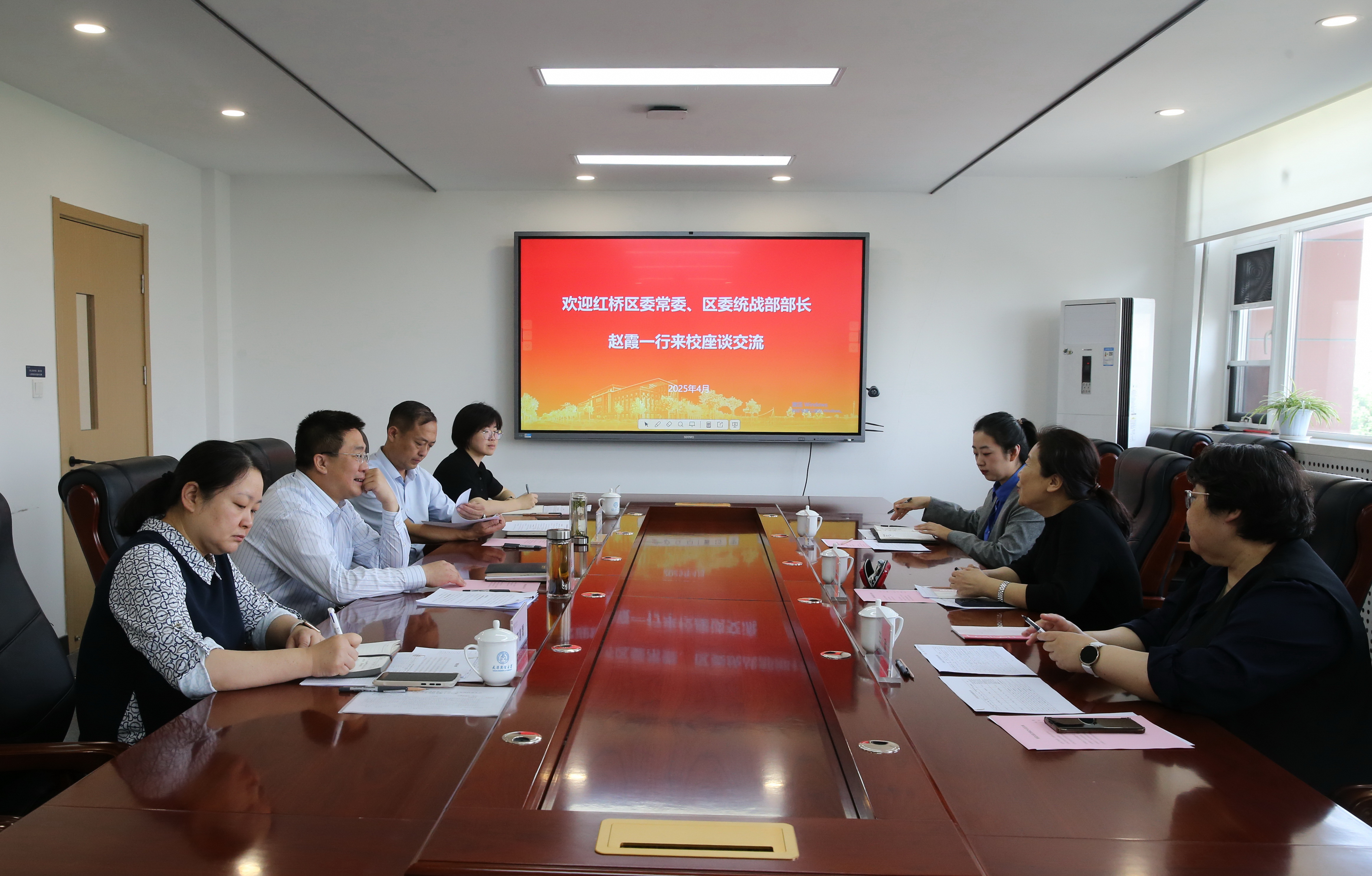崔强对赵霞一行的到来表示热烈欢迎,对红桥区统战部一直以来对学校统战工作的指导和支持表示感谢,并简要介绍了学校基本概况、发展历程、办学特色及统战工作情况。他表示,学校党委高度重视统战工作,并始终将学校统战力量融入红桥区经济社会发展过程中,为红桥发展贡献智慧力量。希望双方继续加强校地交流合作,实现共赢发展。
