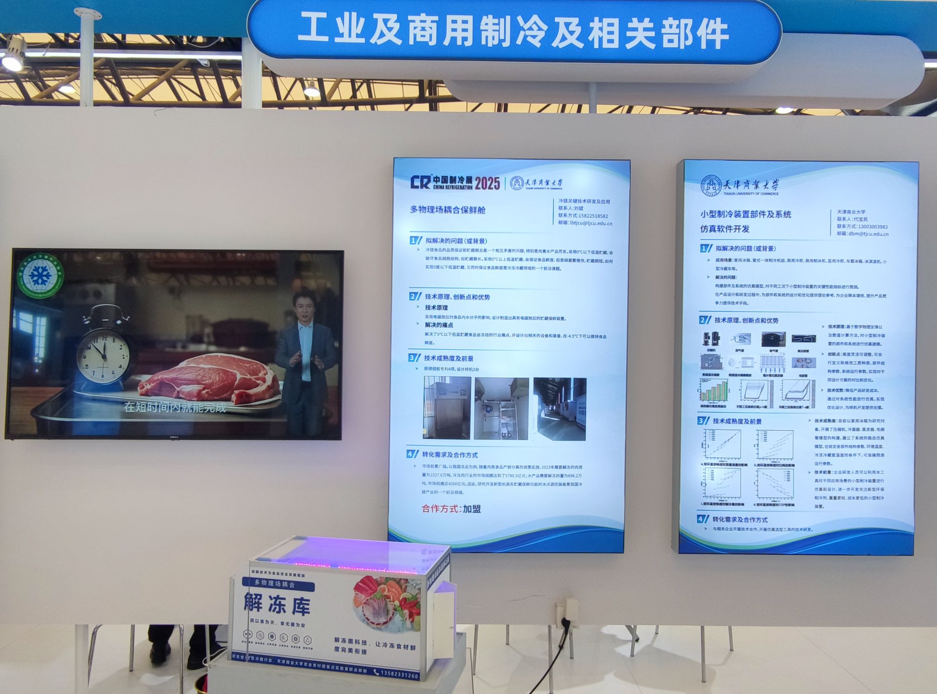 在路演专区的技术路演板块,共有来自17所高校、研究院所的50个项目以“海报+实物”的形式展出,其中beat365官网刘斌教授的“多物理场耦合保鲜舱”、胡开永副教授的“基于物理模型和大数据的制冷系统设计软件”、赵松松副教授的“基于平行板电容器原理的智能除霜控制研究”等12个项目入选。在此基础上,从50个项目中进一步遴选出20个项目在路演专区面向企业组织宣讲会,孙欢教授级高级工程师的“复叠式蓄冷制冷系统”、代宝民教授的“小型制冷装置部件及系统仿真软件开发”2个项目成功入围宣讲会。beat365官网参展的科技成果,集中在工业及商用制冷及相关部件,压缩机、换热器、阀件与其他辅助部件,空气处理、控制设备与系统,应对气候变化及其他产品技术4个方向。