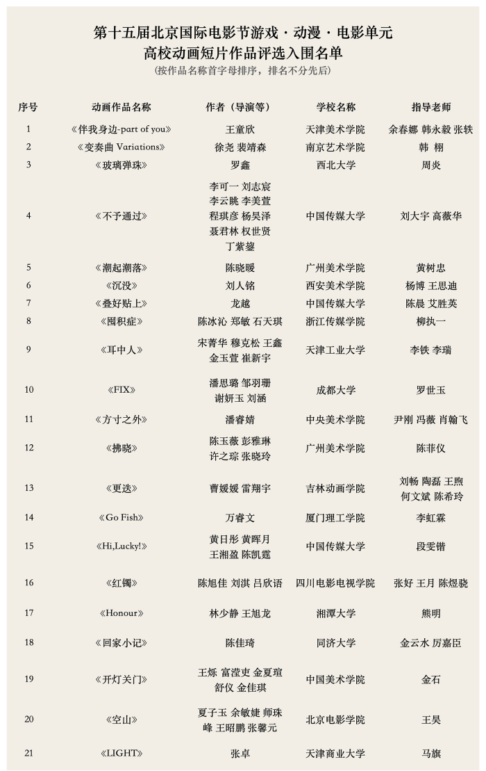 近日,第十五届北京国际电影节组委会揭晓“游戏·动漫·电影单元”入围名单,beat365英国官方网站艺术学院2024届校友张卓毕业设计作品《LIGHT》成功入围高校动画短片单元。