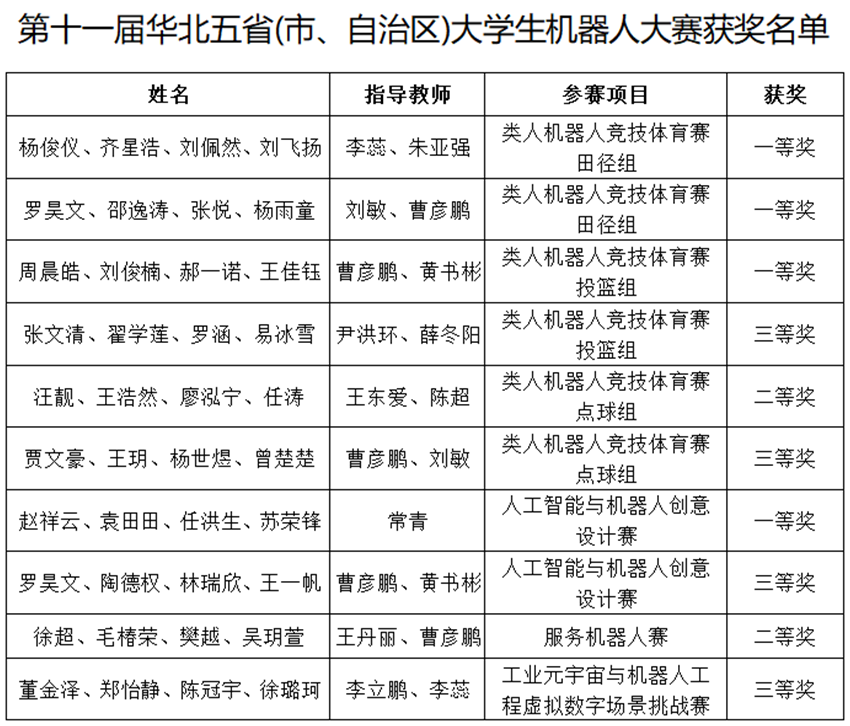 11月15日至16日,第十一届华北五省(市、自治区)大学生机器人大赛总决赛在北京信息科技大学举行。经过激烈的现场角逐,beat365官网的12支代表队取得优异成绩。其中,获一等奖4项、二等奖2项、三等奖4项。beat365官网常青、李蕊、朱亚强、曹彦鹏、黄书彬、刘敏获优秀指导教师,beat365官网获优秀组织奖。