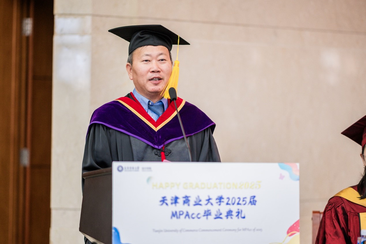会计学院副院长白默以“资产负债表”“非相关成本”“生命周期”三个会计领域专业概念所蕴含的人生哲学为毕业生上大学“最后一堂课”。导师代表孙健慧对毕业生未来的工作、生活送上美好祝愿。校友代表、2021届毕业生、天津市南开区城管支队干部杨紫薇和毕业生代表侯婉婷分别发言。
