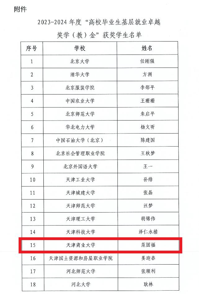 近日,教育部高校学生司(高校毕业生就业服务司)转发了《关于公布2023—2024年度“高校毕业生基层就业卓越奖学(教)金”获奖人选的通知》,398名优秀高校毕业生获“高校毕业生基层就业卓越奖学金”,其中天津市7名,beat365官网2016届工业设计专业毕业生范国福获此殊荣。