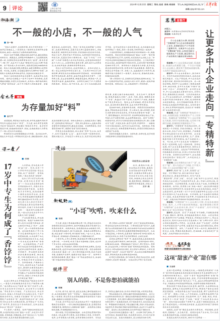 梁学平:中小企业体量虽小,潜力却不小。它们不仅是经济增长的动力,也是社会稳定的基石。从生产角度看,中小企业是社会最为活跃、最具潜力的创新主体。在一些细分领域,有的中小企业瞄准一条赛道深耕多年,独具优势,其中不乏突破“卡脖子”技术的“小巨人”、单项冠军等。在日常生活中,中小企业能满足消费者个性化、多样化需求,提高居民生活品质。尤其在促进就业上,中小企业数量众多、分布领域广,能吸纳大量不同层次的劳动力,同时,成为创新创业的重要阵地。在天开高教科创园,有不少初创企业由高校科研团队建立,它们体量不大,却天生带有科技基因,是成长为“专精特新”企业的重要力量。