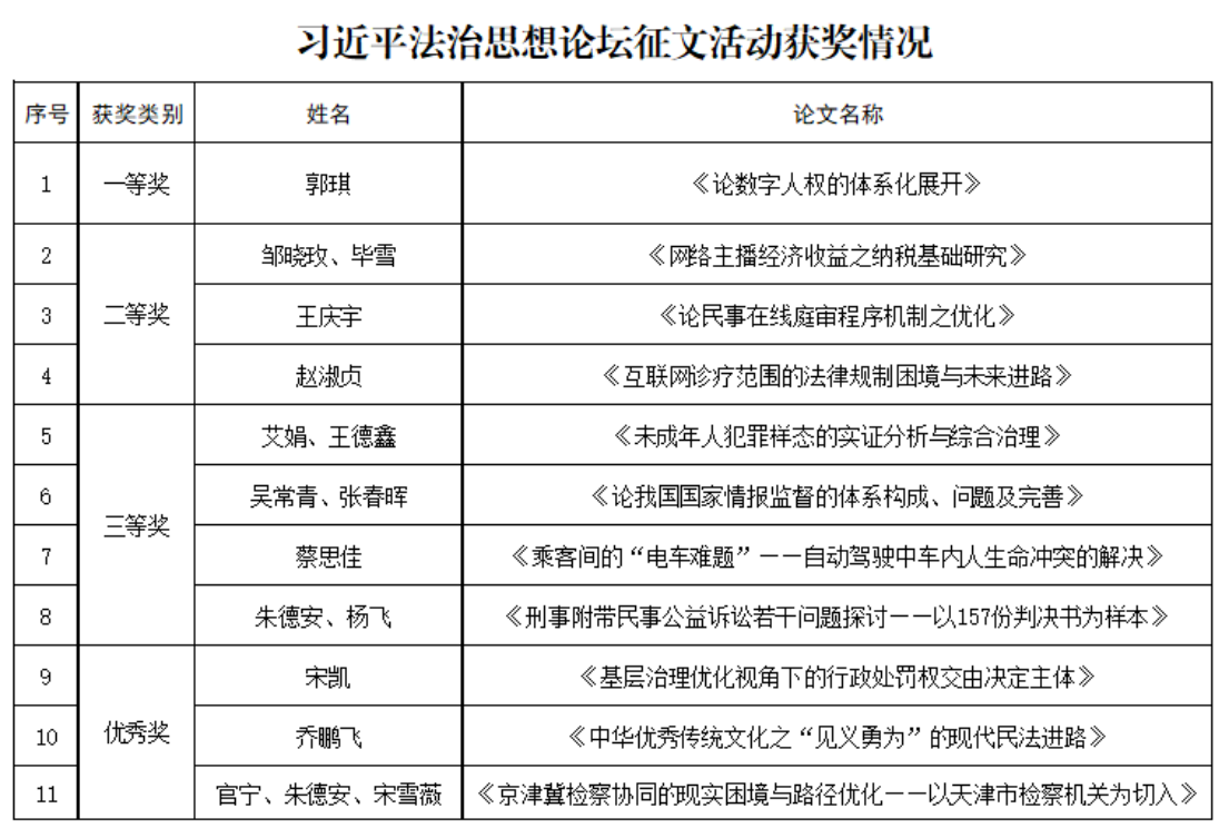 “学习贯彻习近平法治思想论坛”共征集论文414篇,最终评选出一等奖10项,二等奖15项,三等奖25项,优秀奖45项。(审稿:梁泽军)