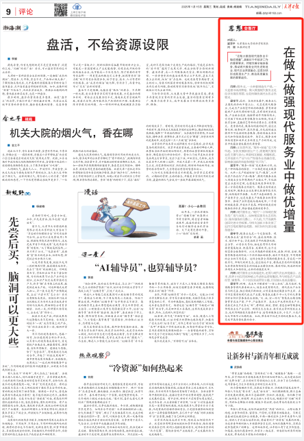 梁学平:“服务+制造”是发展的必然,也是一种新路径的探索。一方面是制造业服务化。从单一生产制造转向“生产+服务”,从单纯卖产品迈向“产品+服务”,将现代服务业嵌入制造业全生命周期的产业链之中,不仅拓宽企业盈利空间,也塑造区域竞争新优势。另一方面是服务业制造化。服务业向制造业反向延伸,服务业企业发挥大数据等技术优势,向制造环节拓展。天津产业基础雄厚、生产要素齐全,这是发展生产性服务业的有利条件。推动产业价值链向高端延伸,一个创新动能更强、开放水平更高、市场环境更佳的服务经济体系,将会塑造更强的竞争力。