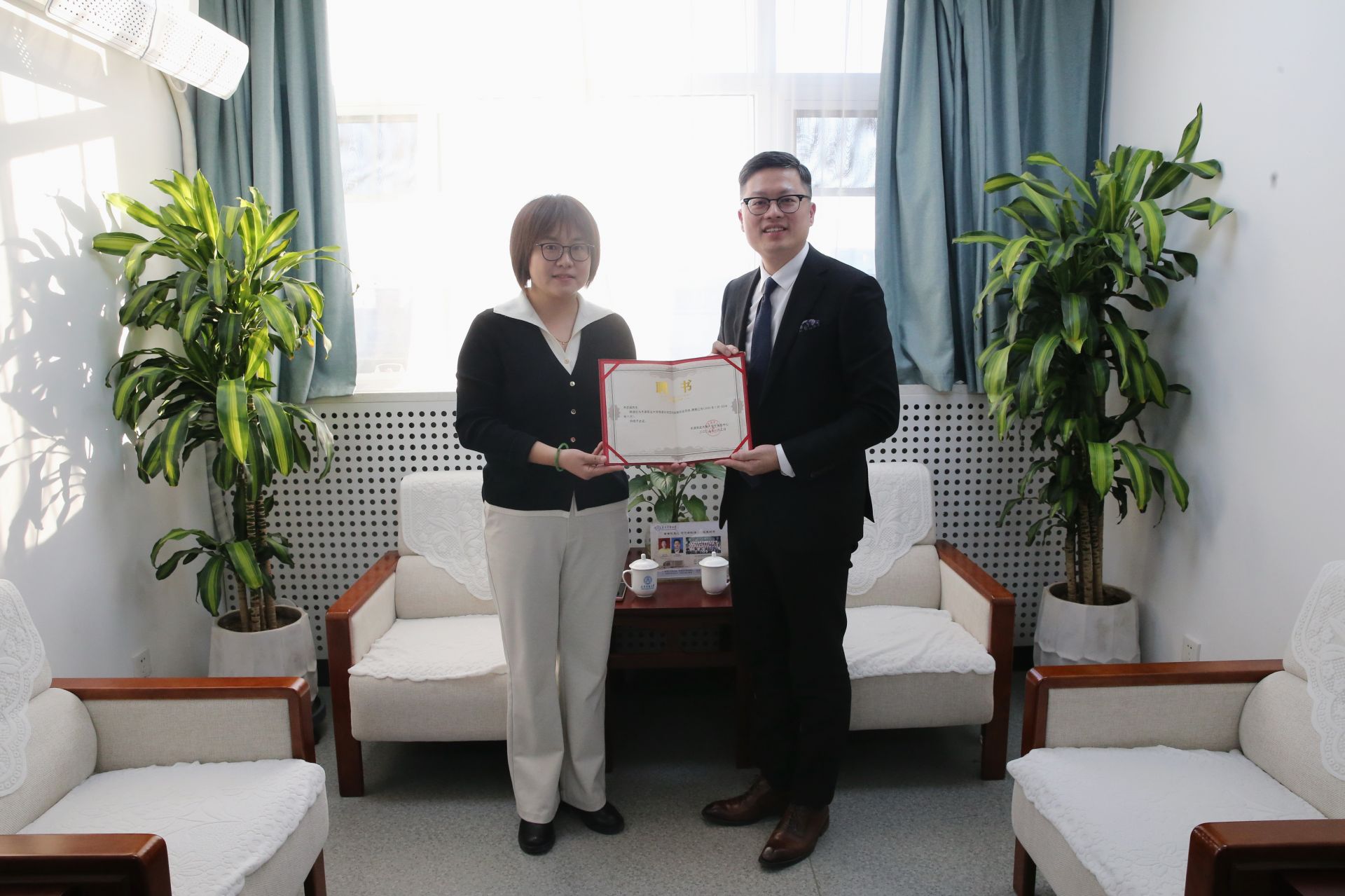 校党委副书记王立云为木忠诚赠送校友纪念品