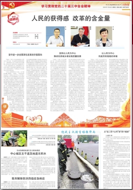 7月26日,《天津日报》学习圆桌会栏目就学习贯彻党的二十届三中全会精神采访校党委书记张亚。张亚表示,党的二十届三中全会将坚持以人民为中心作为进一步全面深化改革的原则之一,强调尊重人民主体地位和首创精神,人民有所呼、改革有所应,做到改革为了人民、改革依靠人民、改革成果由人民共享,体现了中国式现代化鲜明的以人民为中心的价值取向。