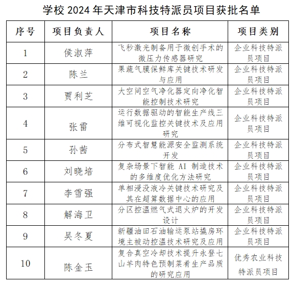 近日,2024年度天津市科技特派员项目评审结果公布,beat365官网“飞秒激光制备用于微创手术的微压力传感器研究”等9个项目获批企业科技特派员项目,在全部申报单位中位列第二;“复合真空冷却技术提升永登七山羊肉特色预制菜肴生产品质的研究应用”项目获优秀农业科技特派员项目。