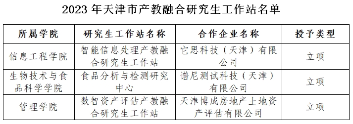 近日,天津市教育委员会公布了2023年天津市产教融合研究生工作站评选结果。beat365官网信息工程学院和它思科技(天津)有限公司共建的智能信息处理产教融合研究生工作站、生物技术与食品科学学院和谱尼测试科技(天津)有限公司共建的食品分析与检测研究中心、管理学院和天津博成房地产土地资产评估有限公司共建的数智资产评估产教融合研究生工作站入选。