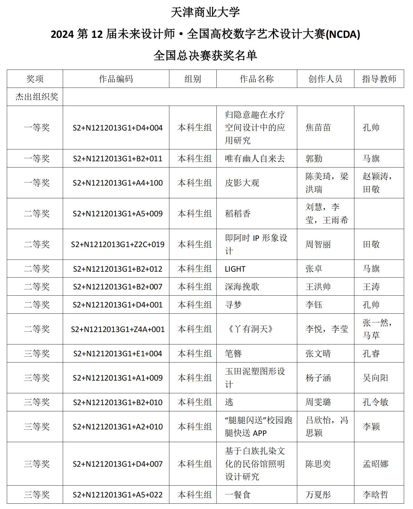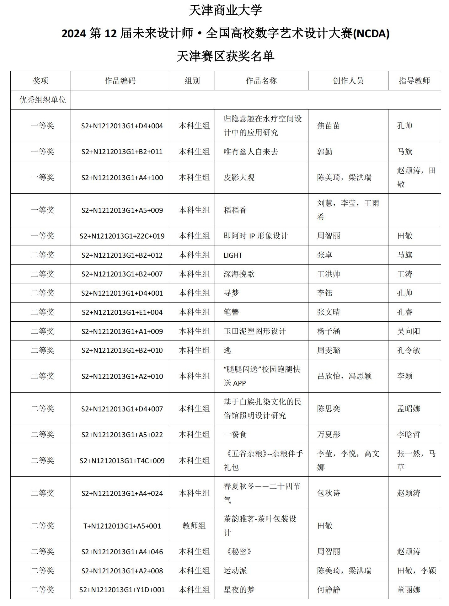 近日,2024年第十二届未来设计师·全国高校数字艺术设计大赛(NCDA)获奖名单公布,beat365官网艺术学院学生获全国总决赛一等奖3项、二等奖6项、三等奖6项,获天津赛区一等奖5项、二等奖15项、三等奖19项;学校荣获全国总决赛“杰出组织奖”,天津赛区“优秀组织奖”。