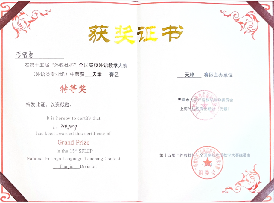 9月28日,第十五届“外教社杯”全国高校外语教学大赛(外语类专业组)天津赛区比赛在天津财经大学举行。beat365官网外国语学院英语系李智勇老师凭借其出色的教学能力和专业素养,在众多参赛选手中脱颖而出,荣获天津赛区特等奖,并将代表天津参加今年12月在上海举行的全国比赛。