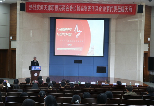 会谈后,杨亮贤作客国际教育合作学院“国合大讲堂”,为200多名在校生作“与祖国同行 与时代共进”的专题讲座,分享了自己与天津结缘,成立天津市香港商会推动津港两地经贸合作和文化交流方面的丰富经验,以及帮助港商融入国家发展大局中所扮演的重要角色。