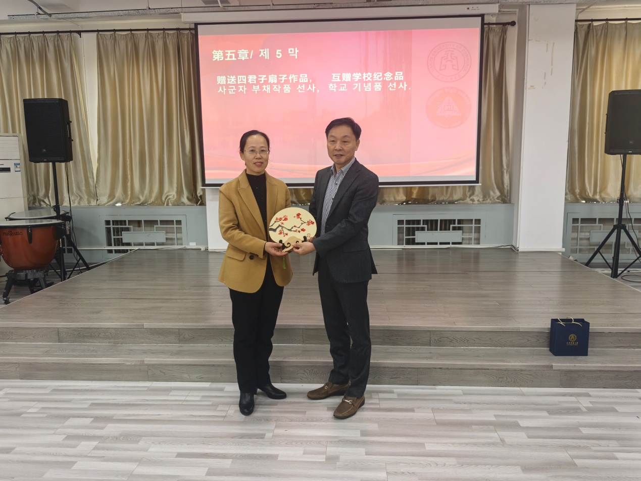 欢迎仪式上,国际教育合作学院党委书记乔秀梅与韩国三槐高中校长孔明铉互赠了纪念品。国际教育合作学院院长曹晓丽对访学团的到来表示欢迎,并介绍了beat365官网国际教育合作学院基本情况。孔明铉对beat365英国官方网站的热情接待表示感谢,并表达了对未来双方深入合作的期待。在随后的艺术交流环节,中韩学生分别带来了古筝、扇画、歌曲、民族舞以及街舞等精彩节目。表演不仅充分展示了中韩两国文化的独特魅力,更传递了中韩学生对两国友谊的美好祝愿和共同愿景。