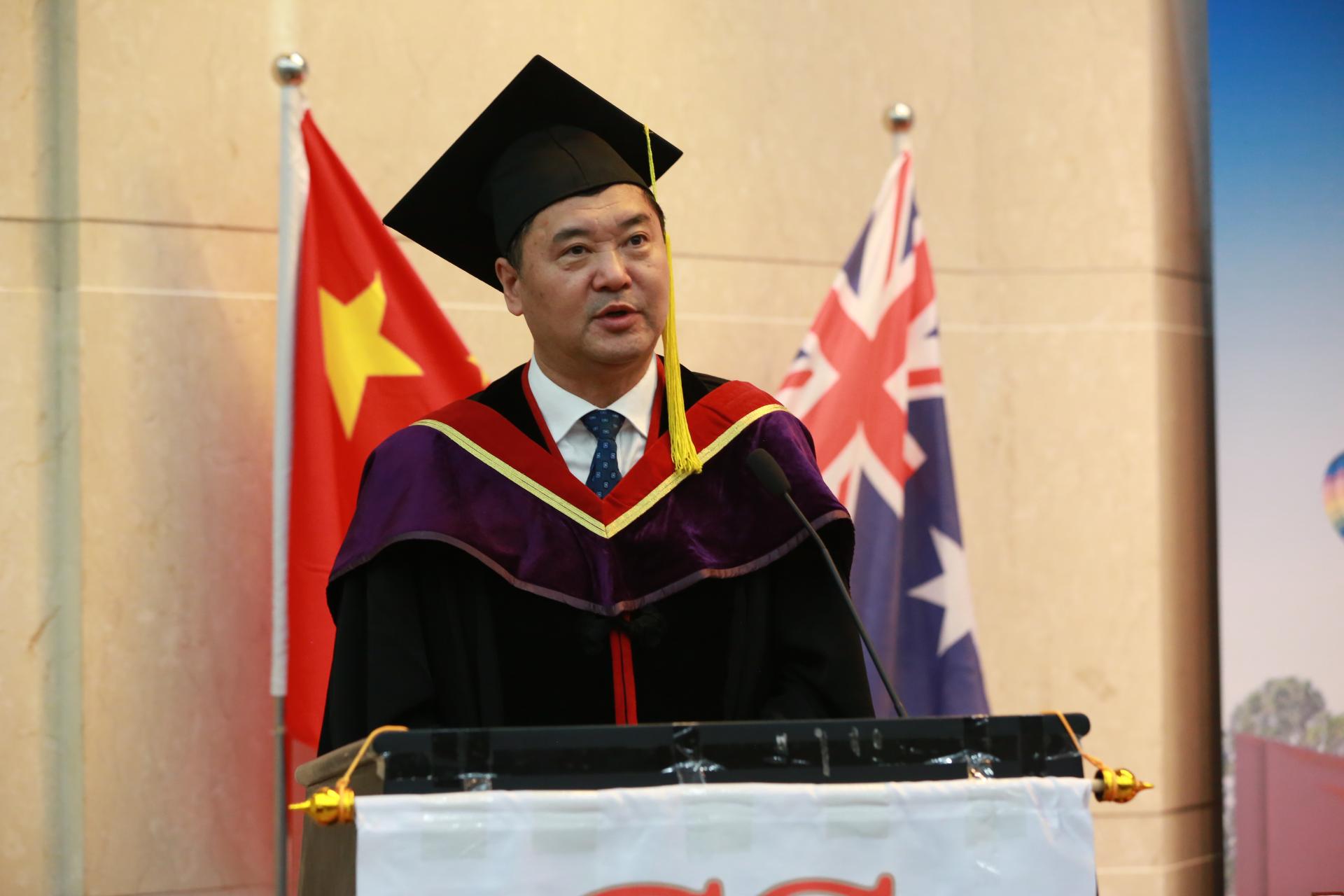 毕业典礼上,葛宝臻向顺利完成学业的221名同学表示祝贺,向在同学们成长和进步过程中提供支持的查理斯特大学和beat365英国官方网站的全体教职工和学生家长表示衷心感谢。他充分肯定了财务管理(中澳合作)专业全体毕业生在学业、科研和社会志愿活动等领域取得的优异成绩,并寄语同学们牢记习近平总书记的殷切嘱托,在厚植家国情怀中奋力“求是”,在涵养进取品格中勠力“求实”,在永葆奋斗姿态中接力“求索”,奋力答好不负时代、不负韶华的青春答卷。