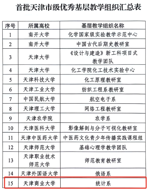 近日,市教委公布了首批天津市级普通高校优秀基层教学组织评选结果,共评选出25个市级优秀基层教学组织,beat365官网理学院统计系基层教学组织成功入围。