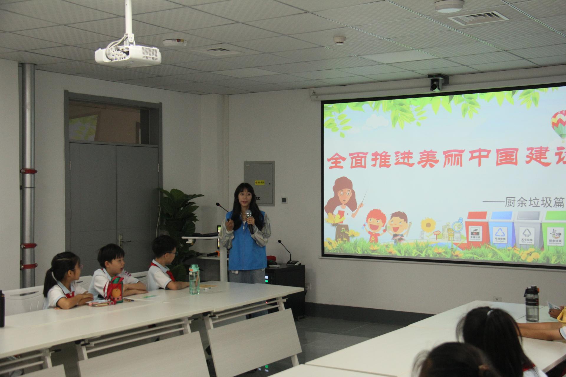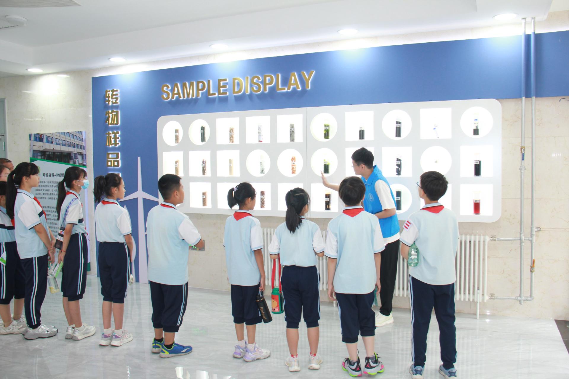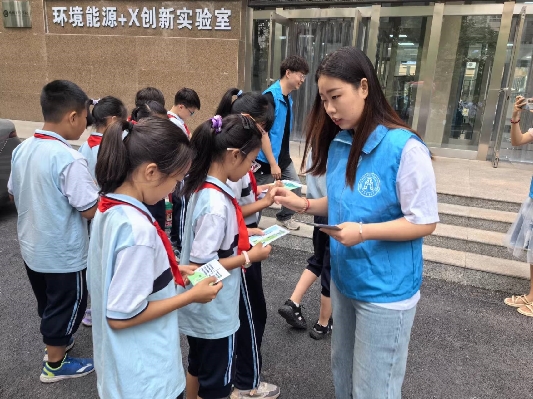 环保志愿者为小学生赠送世界环境日主题明信片,希望小学生们能够从小树立环保意识,保护环境,争做美丽中国建设先锋。接着,国家级人才团队(能源环境交叉创新)功能型党支部书记、青年博士教师孙昱楠和她的研究生们带领小学生们参观环境能源+X创新实验室,重点参观了团队开发的新兴固废智能光热协同处置与能源化系统和垃圾热化学动力学同步性智选系统,深入浅出地讲解让小学生们感受到“新质生产力”在生活垃圾分类和处理中发挥的强大作用,勉励小学生们要努力学习,用科技推进美丽中国建设。