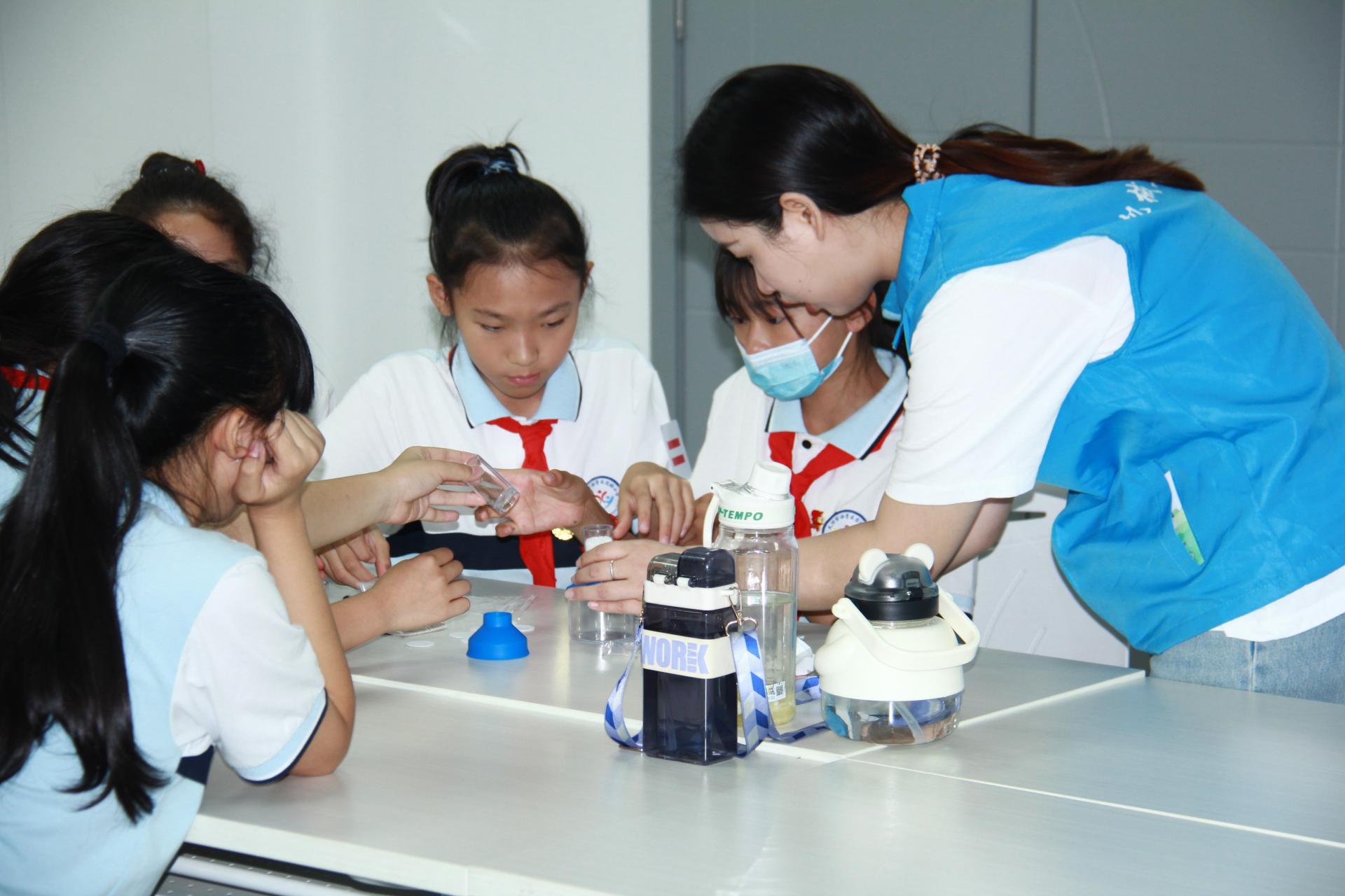 随后,科普志愿者们带领小学生们到1号实验楼413开展科普实践活动。杨秀琇通过PPT和视频的方式向小学生们讲解餐余垃圾如何分类,厨余垃圾变废为宝、“点油成金”的故事。陈薪宇和小学生们利用生活废品开展“净水“和“自制小风车”科普实验。一个个生活垃圾在小学生们的手中变废为宝,展现了环保的“魔法”,动手的环保实验让小朋友收获了满满的成就感,同时也在小学生们的心里种下了环保的种子。