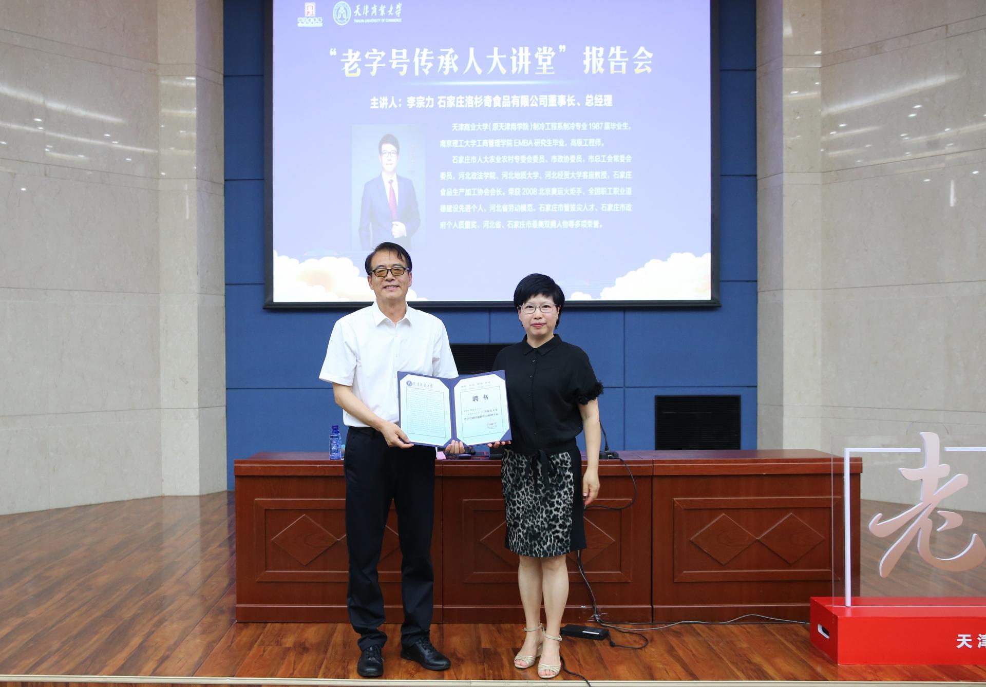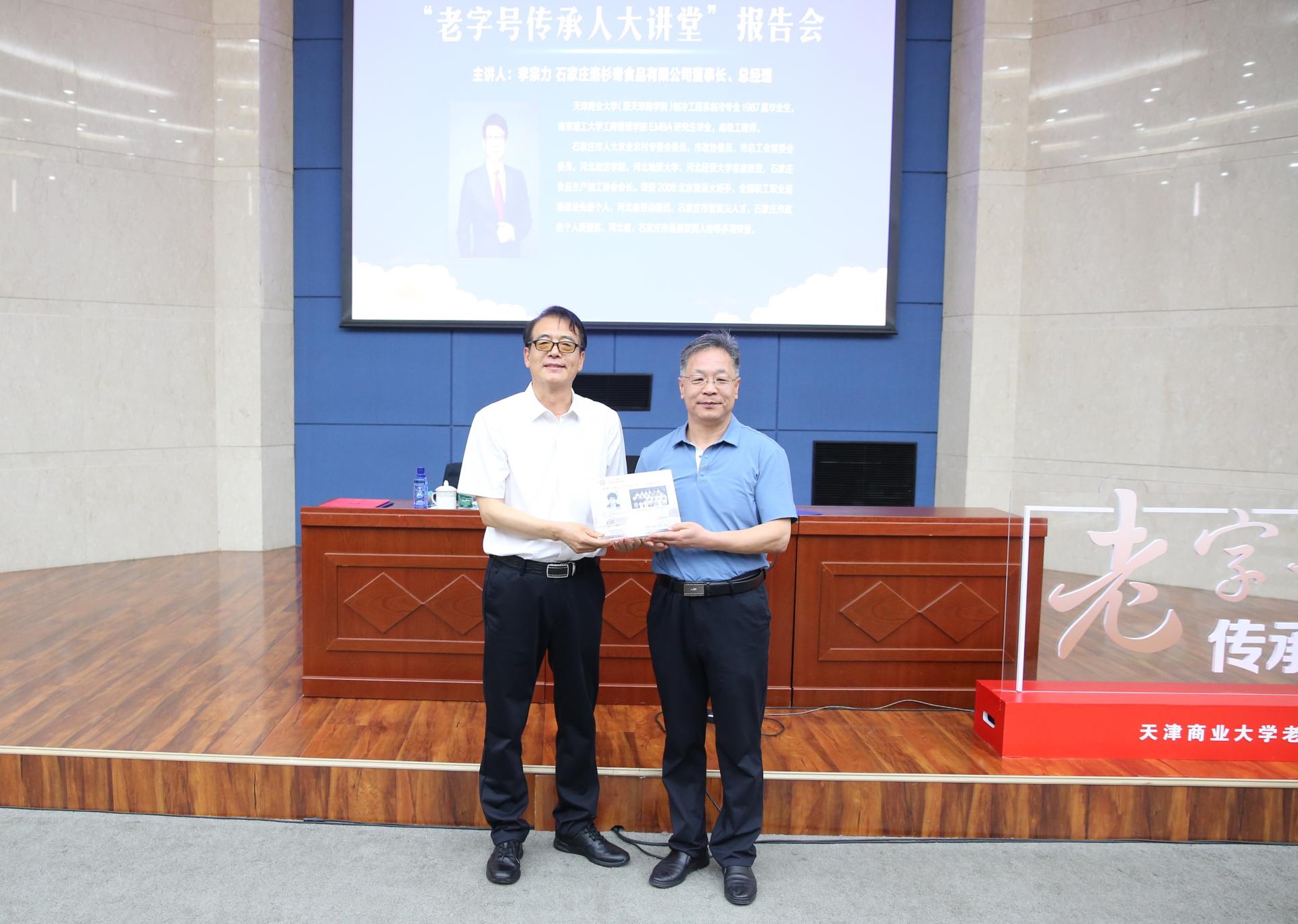 报告会前,王立云为李宗力颁发老字号协同创新中心特聘专家、就业指导校外导师聘书。于俊如为李宗力赠送学籍留念及毕业纪念卡。